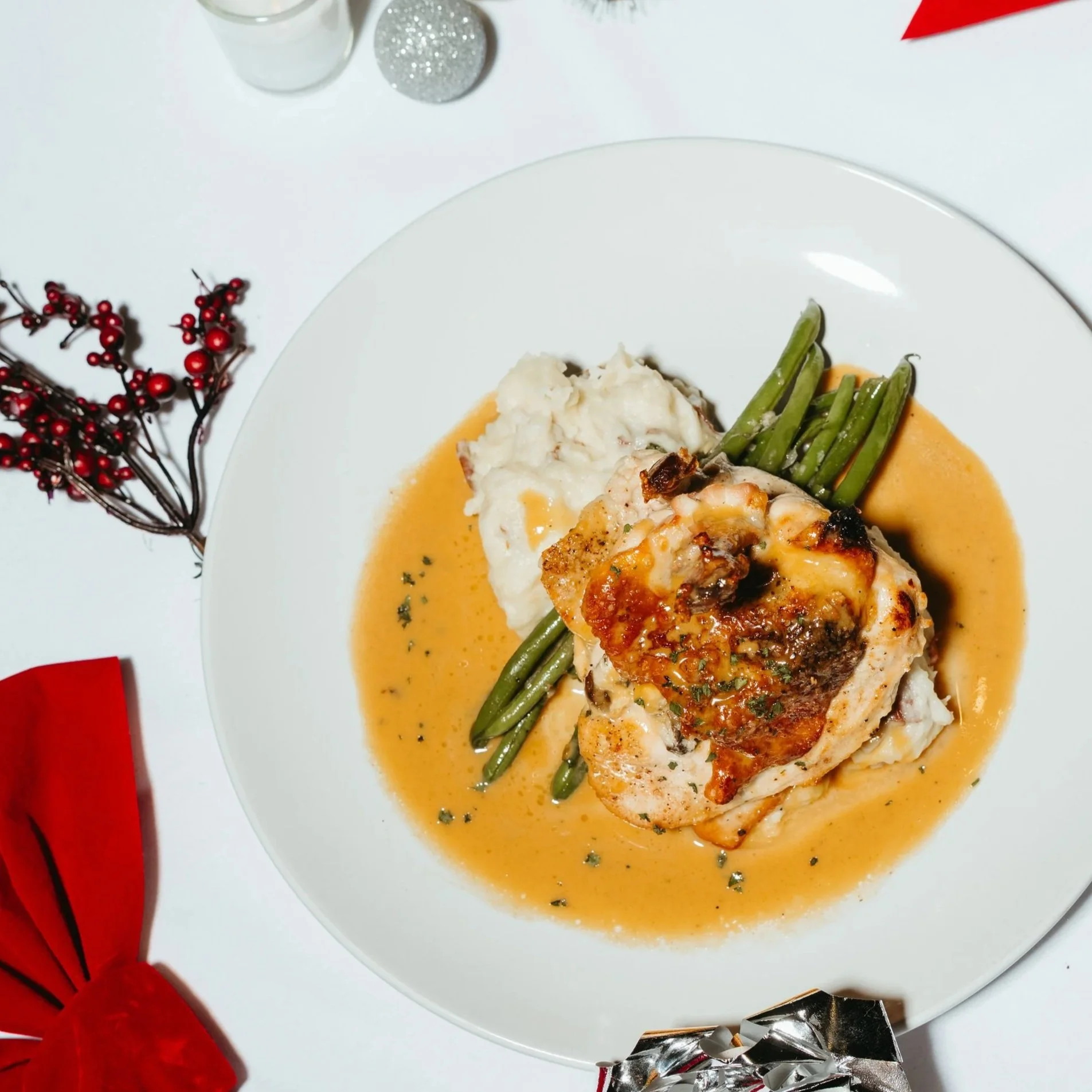 stuffed with goat cheese cream, rosemary, mushrooms, served with smashed potatoes, dijon riesling reduction, haricots verts